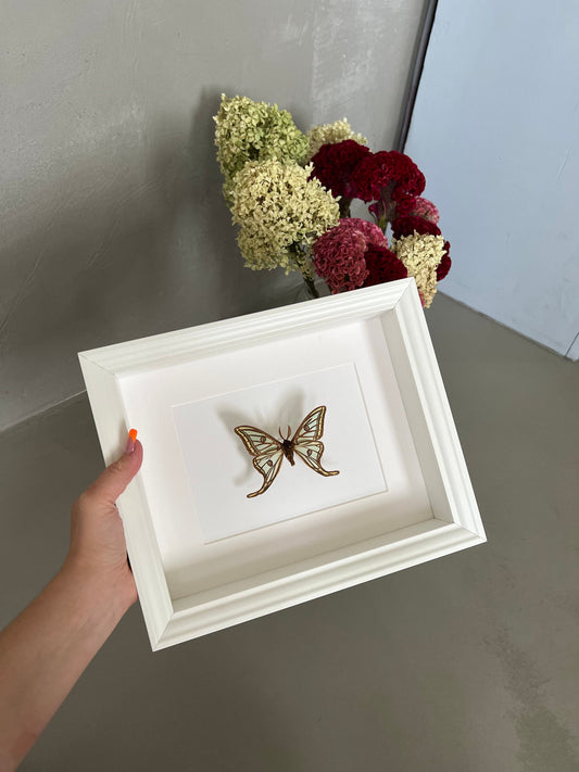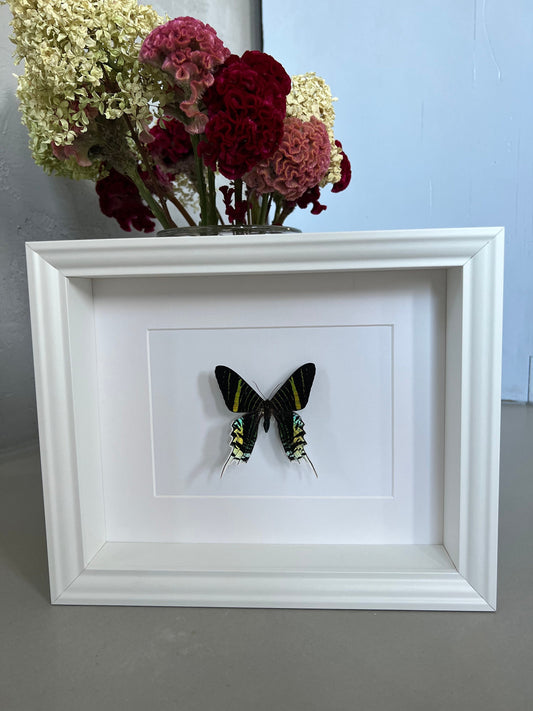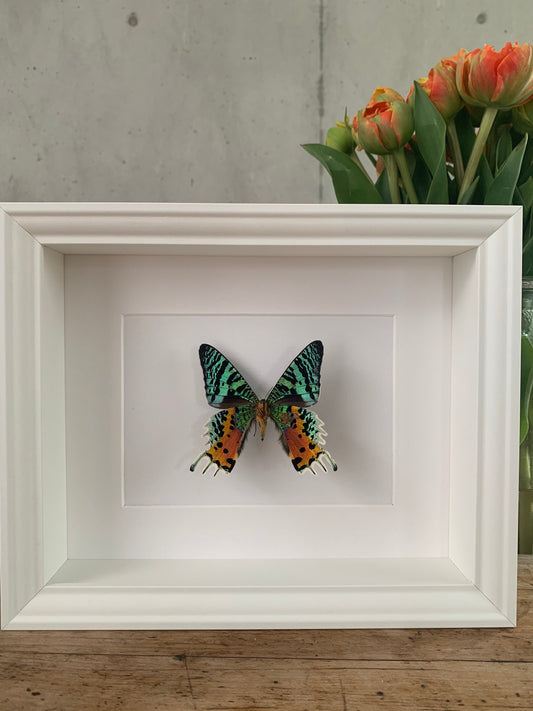 REGENBOGENFALTER - CHRYSIRIDIA RHIPHEUS - Urania ripheus - Sonnenuntergangsfalter Schmetterling im Rahmen - Präparat - Insekt